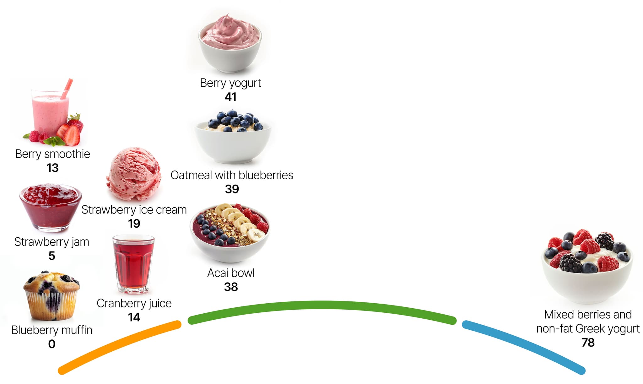 A bit higher scores can be had from acai bowls (38), oatmeal with blueberries (39), or berry yogurts (about 41).